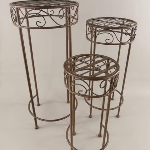 Tämä on kokoelma kolmea upeaa taottua rautaa olevaa kukkapöytää. Erittäin kaunis muotoilu ruskeassa värissä. Sopii hyvin terassille tai nurmikolle. Välimerellinen sisustus. Korkeimman pöydän mitat ovat seuraavat:Korkeus: 33 cmLeveys: 39 cmKaikki tuotteemme pakataan hyvin ja lähetetään vakuutettuna.