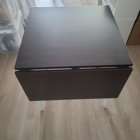 Musta ikean klaffipöytä pieneen huoneeseen. Kun molemmat klaffipalat on alhaalla pöytä on 60 cm, kun ne ovat ylhäällä 120 cm. Leveys 78cm.