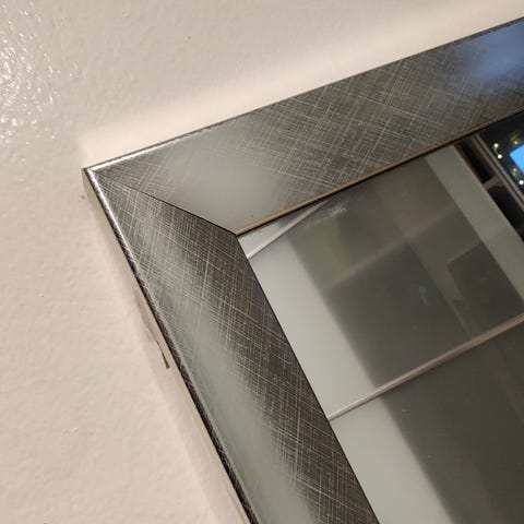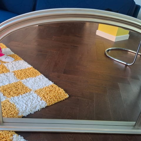 Vanhempien puolesta myyntiin painava hopeinen peili. Jonka voit sijoittaa pystyyn tai vaakaan. Muuten siistissä kunnossa, mutta parista kulmasta on lohjennut takapuolelta pienet palat (kuvat).