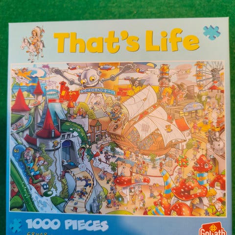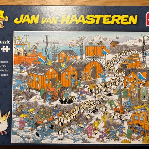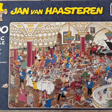 Palapelin kuva-aihe on värikäs, yksityiskohtainen ja siinä seikkailevat tutut hahmot Jan van Haasterenin tunnistettavaan tyyliin.