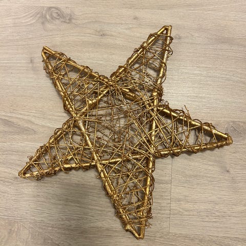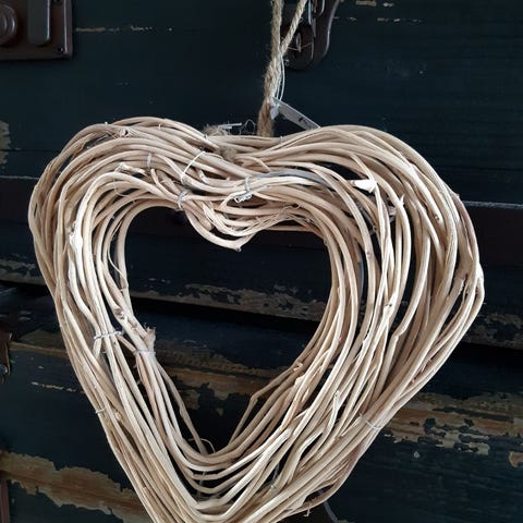 Valkoinen rottinkisydän, jonka keskellä pienempi liitutaulusydän, johon voi kirjoittaa liidulla. Toinen liitutaulupuoli kuluneempi, mutta voi edelleen kirjoittaa siihen. Korkeus noin 36cm, leveimmältä kohdalta noin 35cm. Kiinnitysnaruksi voi halutessaan vaihtaa esim.silkkinauhaan tms.