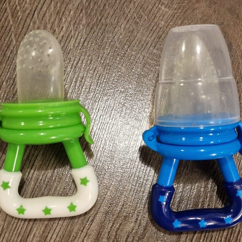 2x Nuk pullo, toisessa nokka ja toisessa tuttiosa.