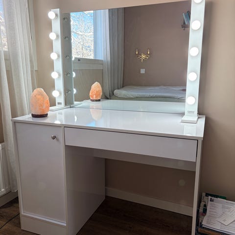 Hyväkuntoinen meikipöytäsetti. Mukana meikkipöytä, pöydän päälle tuleva lasi, 60x100 peili, meikkivalot ja tuoli. Pöytälasissa saattaa näkyä jossain valossa pieniä tahroja, mutta eivät ole isoja tai häiritseviä.