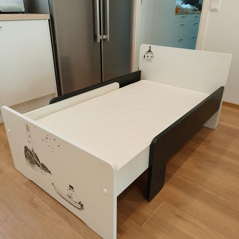 Myydään Muumin jatkettava lasten sänky. Sängyn pituuden voi valita 125cm - 190cm väliltä.