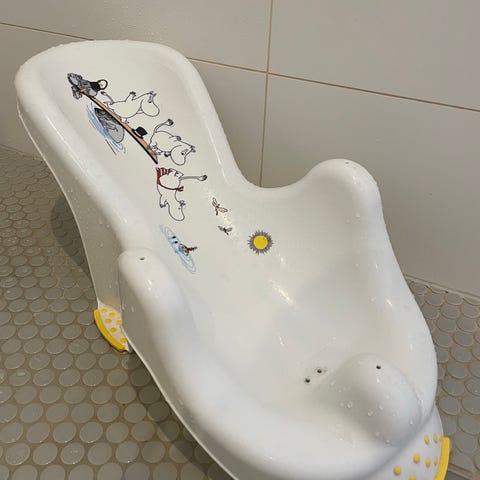 Myydään hyvin vähällä käytöllä ollut Muumi vauvan kylpytuki. Tuolissa on muotoiltu istuinosa vauvalle sekä tukiosat jaloille ja käsille. Pohjassa on imukuppi ja liukuesteet, jotka auttavat pitämään tuolin paikoillaan kylpyammeessa tai suihkualtaassa. Soveltuu vauvan kylvettämiseen ja tukee lasta kylvyn aikana.