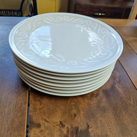 Kuppeja 6kpl, asetteja 9kpl ja leipälautasia 6kpl.