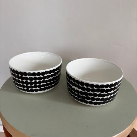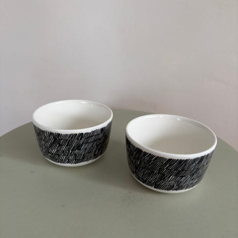 Marimekko kulho. Ollut aktiivisessa käytössä, joten aterinten jälkiä voi näkyä pohjassa. Ne saa puhdistuskivellä pois. Sopii esimerkiksi tarjoiluun tai arki- ja kattamiskäyttöön. Materiaali on lasitettu keramiikka/posliini. Merkitty pohjasta Marimekko-logolla ja kuosin tiedoilla.