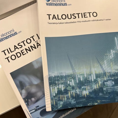 Ekonomivalmennuksen Taloystieto sekä Tilastot ja todennäköisyys kirjat vuodelta 2025. Molemmat hyvässä kunnossa ja päällystetty kontaktimuovilla. Muutamia merkintöjä lyijykynällä jotka voin pyyhkiä pois ennen kauppoja. Haku Itä-Pakilasta tai postitus.