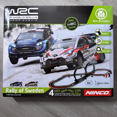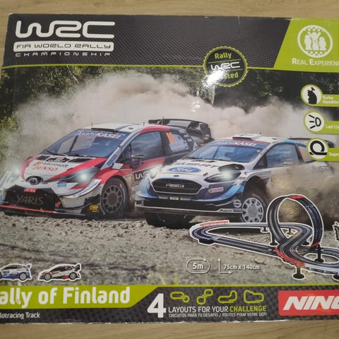 Ninco WRC autoratapaketti. Paketissa on WRC-teemainen sähköautorata, jossa on useita mutkia ja suoria osuuksia. Mukana tulee rataosat, autot ja ohjaimet. Sopii leikkiin ja harrastukseen autourheilusta kiinnostuneille.