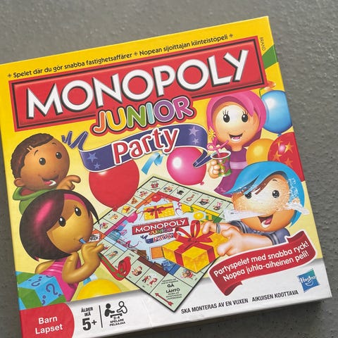 Hasbro Monopoly Junior Party lautapeli lapsille. Peli on suunnattu noin 5 vuotta täyttäneille. Pakkaus sisältää pelilaudan, pelinappuloita, taloja, kortteja, nopan sekä ohjevihkon. Lautapeli on yksinkertaistettu versio klassisesta Monopolysta ja tarkoitettu nuoremmille pelaajille yhteiseen ajanviettoon.