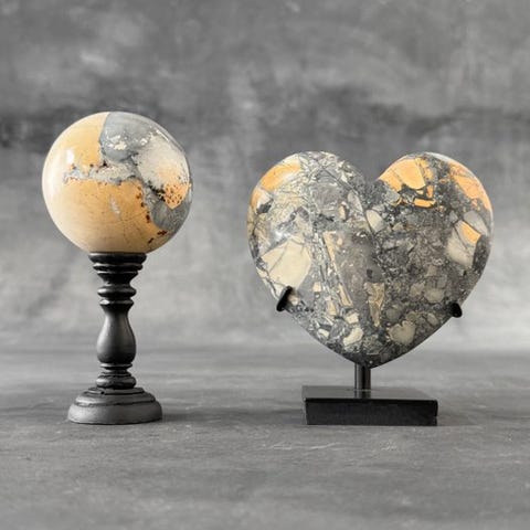 Kaunis pari keltaista maligano jasperia kustomoiduilla jalustoilla.Maligano jasper on erityinen jaspiksen tyyppi, jota esiintyy Indonesiassa ja joka muodostuu muinaisten tulivuoren kuumien lähteiden alueilla. Maligano tunnetaan kontrastisista lämpimistä sävyistään, kuten sinisen ja harmaan eri sävyistä, sekä upeista breksiittisistä, eli rikkoutuneista ja parantuneista, kuvioistaan, sekä hauskoista dendriittisistä kuvioistaan, jotka usein muistuttavat jokimaisemia, joissa on pieniä pensaita vierellä solisevaa jokea.Karkeat mitat - mukaan lukien jalusta.# Pallo: 1 --> Korkeus: 19,5 cm, Halkaisija: 10,4 cm# Pallo 2 --> Korkeus: 14,2 cm, Läpimitta: 6,6 cmVastuuvapauslausekeOle hyvä ja huomioi, että nämä kuvat on otettu pimeässä studiolla, ja värit voivat vaihdella ympäristön mukaan.Paino sisältää pakkausmateriaalin.LähetysKohde lähetetään seurantanumerolla DHL Parcelin, DPD:n tai postNlin kautta. Seuranta päivittyy Catawiki-luettelossasi, kun pakettisi on jätetty postiin.Ole hyvä ja tarkista säännöllisesti välttääksesi pakettisi palautumisen meille, jolloin ostaja vastaa toisen lähetyksen toimituskuluista.Seurantaan Espanjaan ja Portugaliin käytä tätä linkkiä ja lisää Catawiki-erästäsi saatu seurantanumero.https://clientesparcel.dhl.es/LiveTracking/HomeME EMME YHDISTÄ TOIMITUKSIA!!!Jos sinulla on kysyttävää paketistasi, ota meihin yhteyttä Catawiki-viestipalvelun kautta. Pyrimme vastaamaan kolmessa työpäivässä.