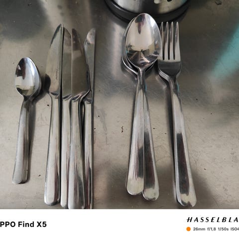 Fiskars Sorsakoski aterimet. Osassa mustan varren väri haalistunut ja käytön jälkeä löytyy. Osaa ei juuri käytetty. Setissä isompia ja pienempiä ruokailuvälineitä.