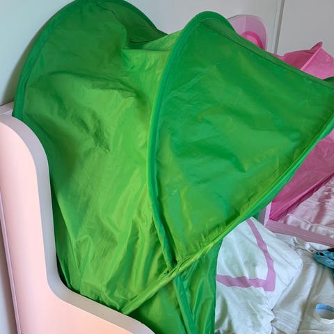 IKEA STUFFLETT lastensängyn teltta, vaaleanpunainen. Teltta on tarkoitettu kiinnitettäväksi lasten sängyn päälle tai ympärille luomaan suojaisan ja leikkisän nukkumis- ja leikkipaikan. Materiaalina kevyt kangas ja joustavat kehikot, jotka pitävät teltan muodossaan. Soveltuu sisäkäyttöön lastenhuoneeseen lisävarusteeksi sänkyyn tai leikkipaikaksi lattialle asetettuna.