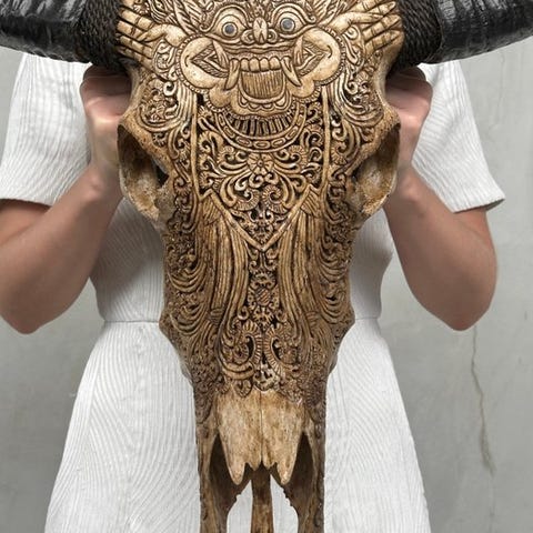 Suuri käsin kaiverrettu vesipuhvelin pääkallo, jonka ovat kaivertaneet taiteilijat, jotka ovat siirtäneet muinaisen kaiverrustaidon isältä pojalle. Kallo on täysin käsin veistetty suurella huolella. Se on epätavallinen, koristeellinen kappale.Kaiverrettu kalloon on kaunis ihmisluurankojen ja ruusujen motiivi.Arvioidut mitatPituus: 83 cmLeveys: 74 cmVastuunrajoituksetKalloon on kiinnitetty kiristysnaru, jotta sen voi asentaa seinälle.- Sarvet irrotetaan kuljetuksen ajaksi, ja ne on helppo kiinnittää uudelleen. Sarvet pakataan aina laatikon pohjalle, kallon alle. Varmistathan, että poistat sarvet ennen pakkauksen hävittämistä.Koska kyseessä on luonnollinen kallo, siinä saattaa olla joitakin luonnollisia pieniä halkeamia ja uurteita sekä kallossa että sarvissa. Tämä on normaalia. Katso kuvia saadaksesi lisätietoja.- Kallomme puhdistetaan ammattilaisvoimin, mutta joskus hampaissa voi esiintyä pieniä värjäytymiä. Tämä on luonnollista ja normaalia, eikä siihen voida paljoa vaikuttaa. Katso kuvat.Olemme lisänneet kuvia käsityöläisistämme työssään antaaksemme kuvan siitä, millainen prosessi on kaiverratetun pään luominen.Paino, joka mainitaan, sisältää pakkausmateriaalin.LähetysKohde lähetetään seurantanumerolla DHL Parcelin, DPD:n tai postNlin kautta. Seuranta päivittyy Catawiki-luettelossasi, kun pakettisi on jätetty postiin.Ole hyvä ja tarkista säännöllisesti välttääksesi pakettisi palautumisen meille, jolloin ostaja vastaa toisen lähetyksen toimituskuluista.Seurantaan Espanjaan ja Portugaliin käytä tätä linkkiä ja lisää Catawiki-erästäsi saatu seurantanumero.https://clientesparcel.dhl.es/LiveTracking/HomeEMME YHDISTÄ TOIMITUKSIA!!!- Jos sinulla on kysyttävää paketistasi, ota yhteyttä meihin Catawiki-viestipalvelun kautta. Yritämme vastata kolmen työpäivän kuluessa.