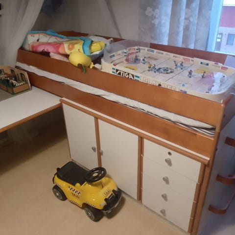IKEA parvisänky metallirunkoinen, harmaa. Sängyssä on korkea metallirunko ja yläosassa yhden hengen vuode. Alapuolella on tilaa esimerkiksi työpisteelle, säilytykselle tai leikkitilalle. Soveltuu lastenhuoneeseen tai pieneen tilaan, jossa halutaan yhdistää nukkumis- ja työskentelytila pystysuunnassa.