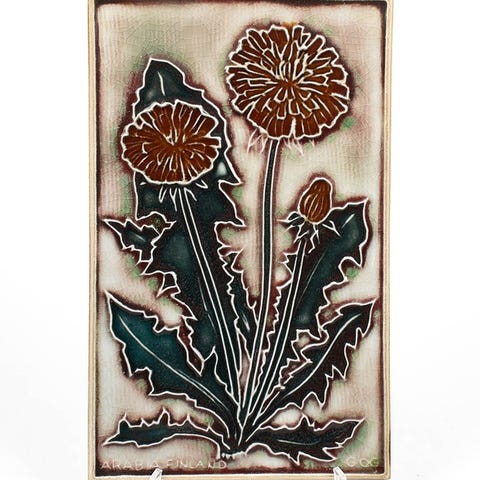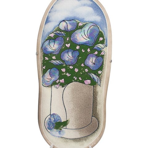 Keramiikkainen seinälaatta, jossa on kukka-aiheinen kuva. Laatta on soikean suorakaiteen muotoinen ja sen taustaväri on vaalea. Etupuolella on maalattuna maljakossa olevia kukkia eri väreissä, ja tausta on koristeltu vihreillä ja ruskeilla sävyillä. Takapuolella on metallinen ripustuskehikko, jonka avulla laatta voidaan kiinnittää seinälle pystyyn. Soveltuu sisustuselementiksi esimerkiksi olohuoneeseen, keittiöön tai eteiseen.