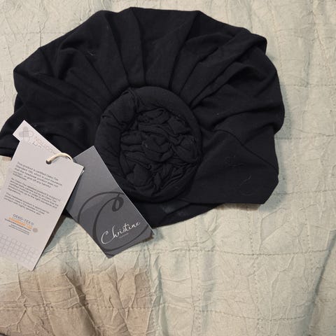Trikoopipo turbaani, keltainen jossa kukkakuosi.