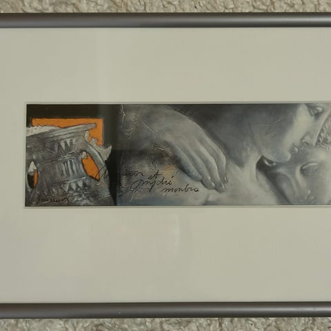Myydään vihreäsävyinen papyrus-taulu, kehysliikkeessä kehystetty. Leveys kehyksineen 44, korkeus 51