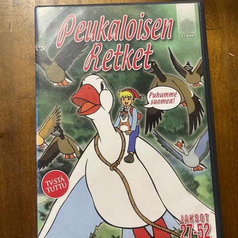 Peukaloisen retket DVD-boksi, joka sisältää animaatiosarjan jaksot 1–52 suomenkielisellä ääniraidalla. Pakkaus koostuu kahdesta erillisestä DVD-kotelosta: ensimmäinen sisältää jaksot 1–26 ja toinen jaksot 27–52. Tuote on suunnattu koko perheelle ja sopii erityisesti lasten katseltavaksi. Formaatti on DVD, aluekoodi ja tarkka kesto ilmenevät koteloiden takakansista.
