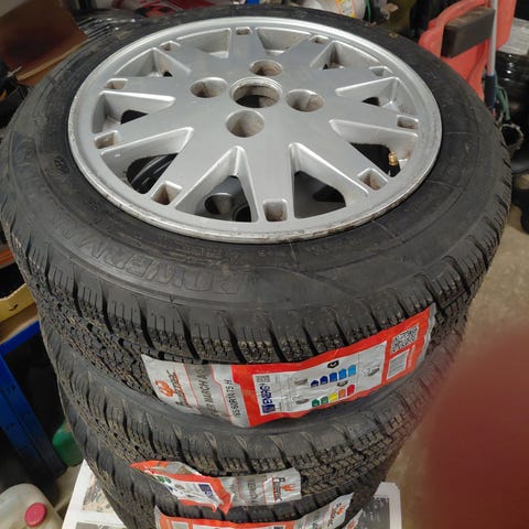 Myydän kesän alussa ostetuilla renkailla, takarenkaat kuluneet suht paljon sisäreunalta, mutta hyvin ajaa vielä. Vanteissa hiukan kulumaa ja pitäisi pestä kunnolla. Vanteiden keskireikä on 73.1mm mutta laitettu soviterenkaat > 66.6mm