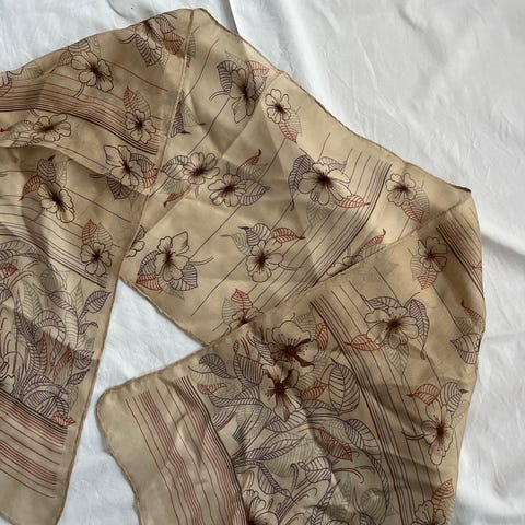 Hyväkuntoinen, kaunis huivi liilalla pohjavärillä ja sievällä kukkakuosilla. Koko n. 86 x 86 cm.