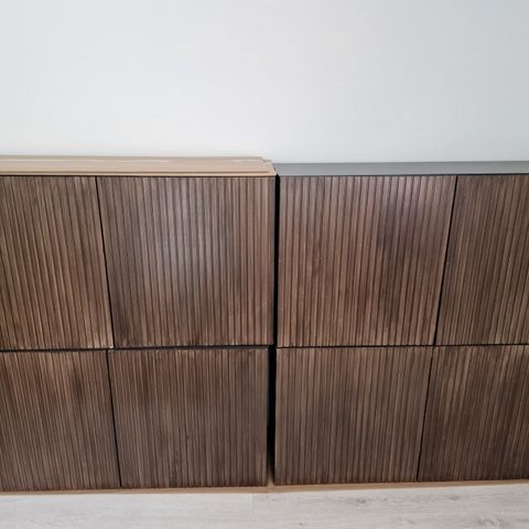 Seinähyllykokonaisuus, jossa työpöytä vetolaatikoilla ja kaksi liukuovellista kaappia. Kaappien sisällä lasiset hyllyt.