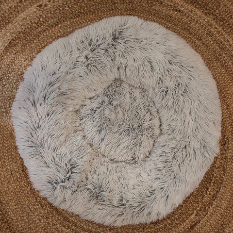 Vaaleanharmaa pörröpeti koko XL, eli halkaisija yli 80cm. Hyvä käytetty kunto, pehmeä ja muhkea ja koiralle mieluinen, mutta 4 muuta petiä saa nyt riittää :)