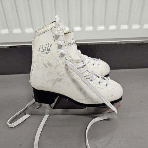 Hyväkuntoiset lasten luistimet koko 33. Pinnassa hieman mustaa jälkeä ja nauhoissa värjäymää.