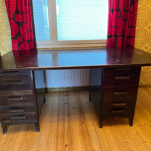 Myydään antiikkityöpöytä laatikolla. Laatikolta yksi kisko puuttuu, mutta pysyy paikoillaan, joten ei painavia asioita kestä. Leveys 109cm, korkeus 74,5cm.