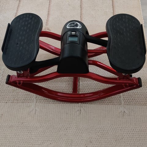Digitaaliselta näytöltä pitäisi voida seurata harjoituksen perustietoja, kuten aikaa ja askelten määrää. Kuvissa näyttö toimii mutta pariston vaihdon jälkeen, en saanut näyttöä enää päälle. Muuten laite toimii vastuksineen hyvin.