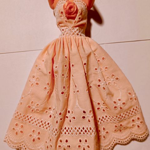 Kaunis sininen, valkoisella turkiksella reunustettu pitkä, hupullinen samettitakki Barbien kokoisille nukeille. Käyttämätön ja erittäin hyväkuntoinen.