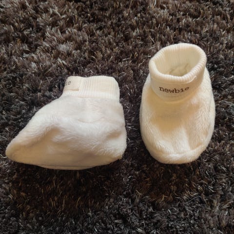 Newbie vauvan tossut unisex-käyttöön. (Huom tuotemerkkinä lukee ”Adidas”, ei antanut valita Newbieta). Väri on valkoinen. Koko on 0–3 kuukautta. Tossuissa on pehmeä päällinen ja resorivarsi, joka auttaa pitämään tossut jalassa. Materiaalikoostumus pesulapun mukaan: päällinen 100 % polyesteriä, vuori 100 % puuvillaa, pohja 100 % polyamidia. Sopivat vastasyntyneelle ja noin 3 kuukauden ikäiselle vauvalle sisäkäyttöön.