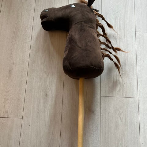 Teddykompaniet keppihevonen, ruskea pehmoinen hevosen pää puisella kepillä. Hevosella on musta harja ja häntä sekä mustat ohjat ja riimu. Mukana erilaisia varusteita, kuten riimuja ja naruja.