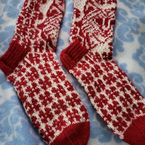 Myydään Pohjois-Savon maakunta sukat. Koko 38 - 39. Neulottu Novita langasta.