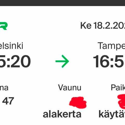 VR Pendolino 947 -junalippu reitille Helsinki–Turku (Turku, City Centre, Logomo). Lähtö Helsingistä klo 09.35 ja saapuminen Turkuun klo 11.39. Matka-aika noin 2 tuntia 4 minuuttia. Kyseessä opiskelijalippu