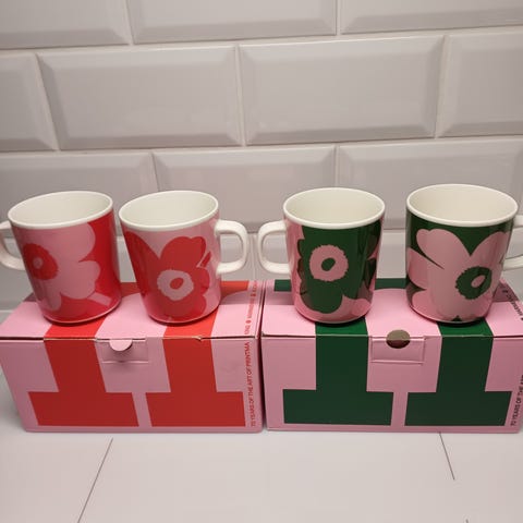 Myydään Marimekon beige-valko-vaaleanpunaiset mukit, mukeja ei ole käytetty, vetoisuus 4dl. Hinta kahdelle mukille 30€