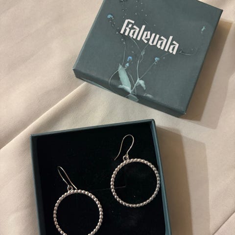Kalevala Koru hopeiset Valoisa korvakorut, sormus ja kaulakoru. Korvakorujen halkaisija n. 17 mm, kuvasta poiketen korvakoruista puuttuu lukot. Sormuksen koko n. 17, 5 mm. Kaulakorun riipuksen halkaisija n. 35 mm ja ketjun pituus n. 49.5 cm.