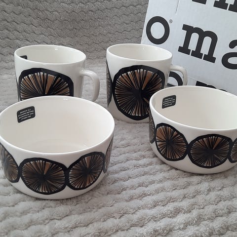 Myydään käyttämättömät Marimekko Appelsiini mukit, kolo 4dl, hinta kahdelle mukille 35€