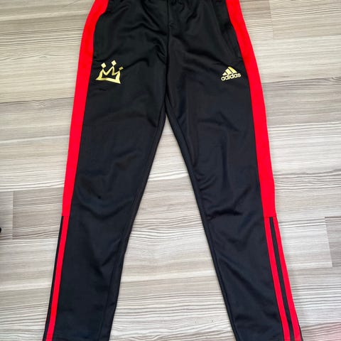 Adidas lasten housut, koko 128 (noin 7–8-vuotiaille). Väri musta, sivuilla valkoiset raidat. Materiaali on kevyt ja hengittävä urheilukangas. Taskuissa ja lahkeissa vetoketjut.