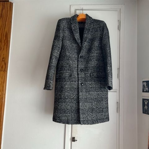 Tummanharmaa, siisti villakangastakki. S koko. Mitat: kai-kai 55 cm, hihan pituus olalta 60 cm. Selän pituus 81 cm.