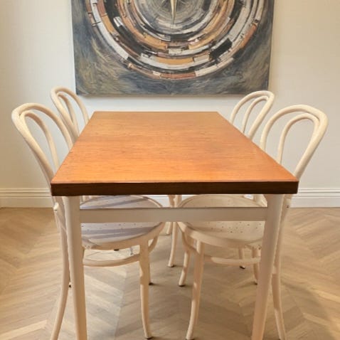 Myydään kaunis teak-ruokapöytä. Ajaton ja pelkistetty malli, sopii hyvin niin pienempään ruokailutilaan kuin keittiöönkin.