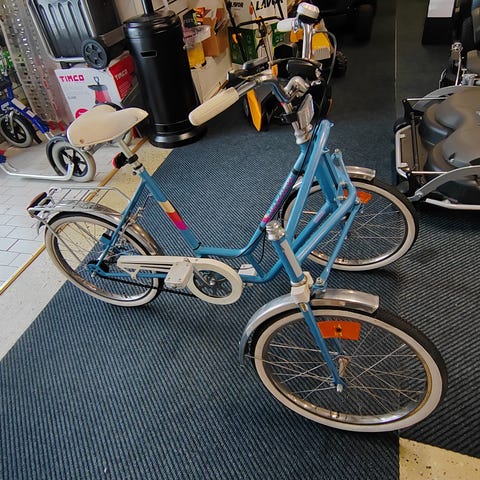 Helkama kolmipyöräinen polkupyörä unisex-käyttöön. Pyörässä on 20" renkaat ja L-kokoinen runko. Malli soveltuu aikuiselle tai isommalle nuorelle käyttäjälle, joka tarvitsee kolmipyöräisen rakenteen tuomaa lisävakautta. Takana on metallinen tavarakori kuljetusta varten. Pyörässä on matala runko helpottamaan kyytiin nousua ja poistumista. Värinä on punainen ja satula on säädettävissä käyttäjän pituuden mukaan. Sitä on käytetty vain vähän. Uuden hinta on noin 1300 €.