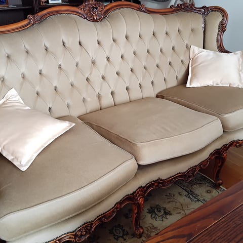 Ostettu aikoinaan Kruunukalusteelta ja maksanut ostohetkellä yli 50 000 markkaa. Päälysteet alkuperäiset ja aitoa englantilaista villaplyysiä. Sohva on käsin tehty Italiassa.
