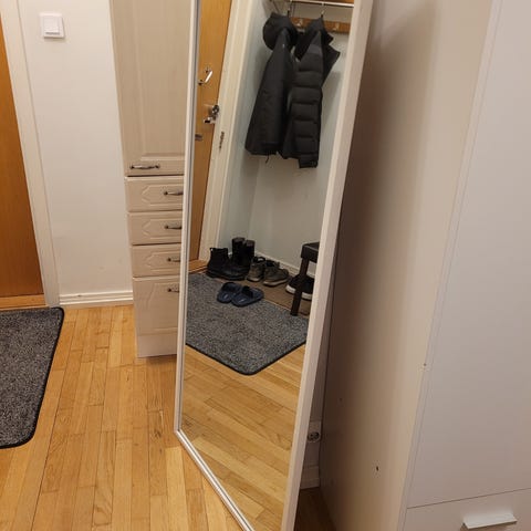 Jyskin vaalean puun sävyinen kokovartalopeili. Kunto hyvä, lukuunottamatta pientä kulumakohtaa, joka viimeisessä kuvassa. Mitat 68x152. Nouto.