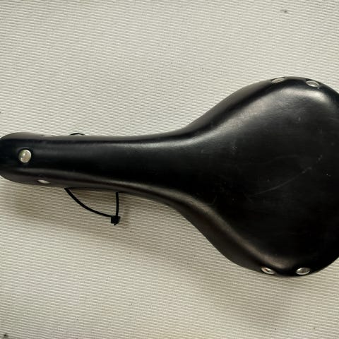 Huollettu nahkasatula, joka ollut käytössä. Putsattu ja nahka hoidettu rasvalla. Välinelaukun lenkit ehjät.
