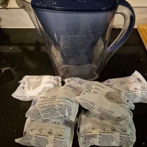 Brita vedensuodatinkannu ja 3 suodattimen täyttöpakkaus.
