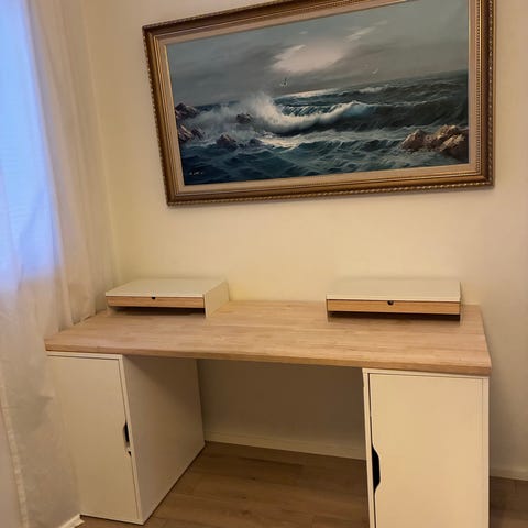 Pyökin värinen työskentelytaso jossa molemmin puolin korkeat kaapit. Vasemmalla puolella on lasiovellinen hyllykaappi säädettävillä hyllyillä, oikealla puolella avointa hyllytilaa sekä alhaalla ovellinen kaappi. Keskellä on kaareva työskentelytaso ja sen yläpuolella yhdistävä hylly.