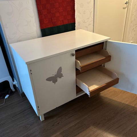 Kaappivanhus osaaviin käsiin. Vaatii uuden maalin. Yksi avain tallessa. Sisällä hyllyt.