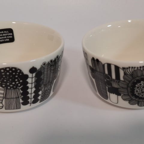 Marimekko Oiva Siirtolapuutarha kulho mustavalkoinen. Keraaminen kulho, jossa on musta Siirtolapuutarha-kuosi valkoisella pohjalla. Soveltuu esimerkiksi tarjoiluun, aamiaiskulhoksi tai jälkiruoille. Kulhon pohjassa Marimekko- ja Oiva Siirtolapuutarha -merkinnät. Käytetty erittäin vähän eli ei kolhuja naarmuja tms.