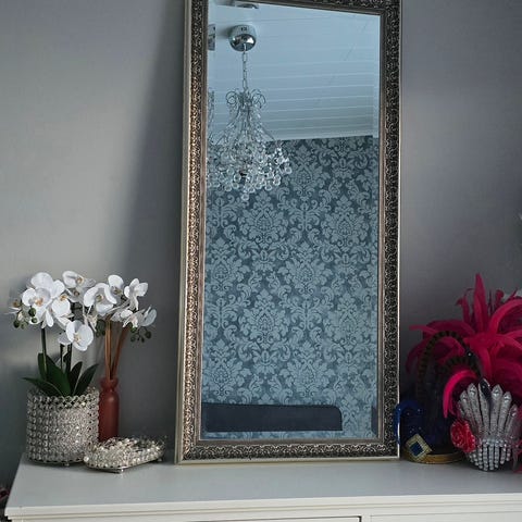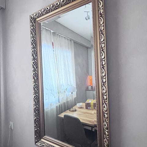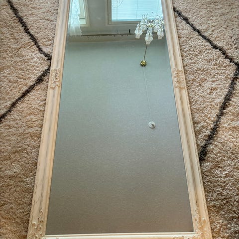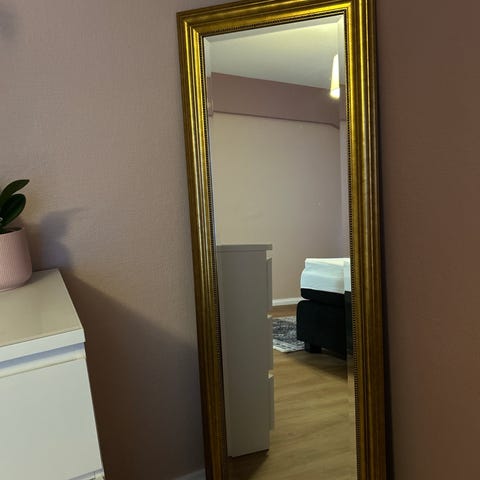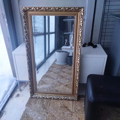 IKEA peili, jossa kultainen kehys ja kulmista muotoiltu yläreuna. Sopii seinälle olohuoneeseen, eteiseen tai makuuhuoneeseen. Kuin uusi.